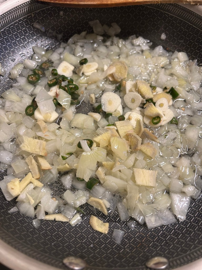 Add in the garlic, ginger and chillies again frying for 3 minutes.