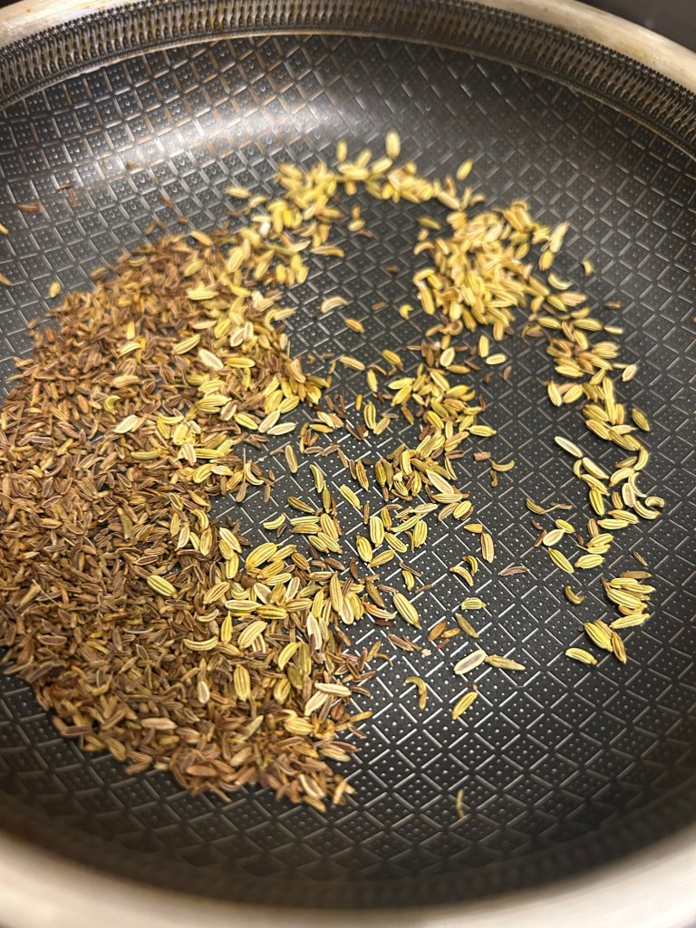 Toast your cumin & fennel seeds in a hot pan for 90 seconds and set aside.