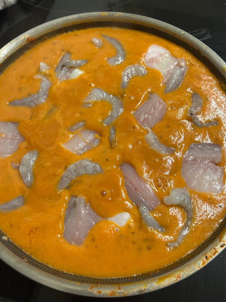 Add the fish & prawns poaching in the thick sauce again for 5 minutes.